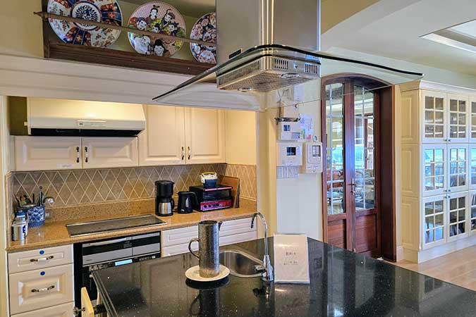 キッチンにはこれらの調理器具や豪華な食器類が完備されています。